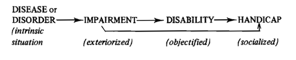 Thus the causality of disability and handicap are mapped out as resulting from impairments (which are themselves designated the results of disease or disorder).