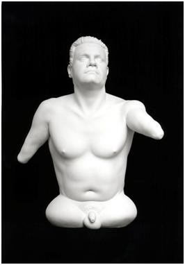 “I was in the British Museum looking at people admiring the fragmented marble statuary, when it struck me that if someone whose body was in the same shape as the sculptures were to come into the room, most of the admirers would have the opposite reaction. It was interesting to me to see what is acceptable in art, but unacceptable in life. As I made the series of works, I realised that they were also about what a beautiful body is, and how narrow our vision of that is, and about the connection between inside and outside. By that I actually mean disconnection, for when one of the models for these pieces closes their eyes, they feel the same inside as you or I, yet often physically disabled people are treated as if they are mentally disabled. Although the models’ bodies are visually comparable to the antique fragmented marble statues, of course my sculptures are portraits of whole people and not fragments of people. That was interesting to me, too.” – Marc Quinn, Recent Sculptures Catalogue, Groninger Museum, 2006