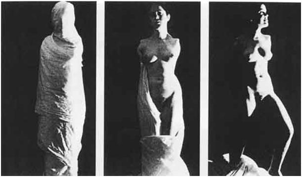 “By confronting people with my naked body, with its softness, its roundness and its threat I wanted to take control, redress the balance in which media representation of disabled woman is usually tragic, always pathetic. I wanted to hold up a mirror all those people who had stripped me bare previously … the general public with their naked stares, and more especially, the medical profession” (cited in Davis 2004, p 63). The disabled body, turned to stone by the gaze of the ‘normal’ spectator in a reversal of the Medusa petrifaction, is released in a triumphant shedding of the veil, a reappropriation of the flesh-subject. At one stage her body is reminiscent of the Milo Venus, dramatically lit to emphasise its statuesque, marmoreal form. This reveals the hypocrisy underlying the idea that a human without arms is not beautiful but an armless statue is regaled as the paragon of classical (female) beauty! Kirkpatrick believes that society’s striving for bodily perfection makes us recoil from a living Venus de Milo, possibly afraid of “contamination by association“.
