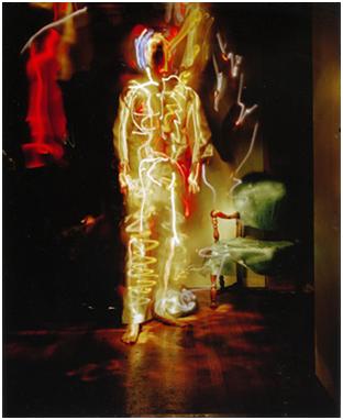 “I use any light source I can understand.” His palette includes flashlights, candles, lasers, lighters, even black powder. The roving light is an uncanny substitute for the artist’s missing sight. The touch of the light sketches an image onto the film. Areas that the light misses remain blanks, darkness, unseen.
