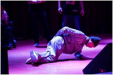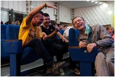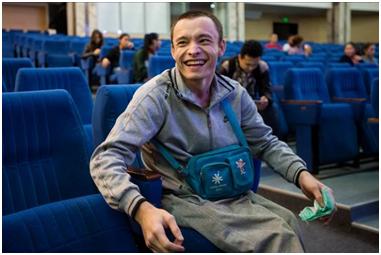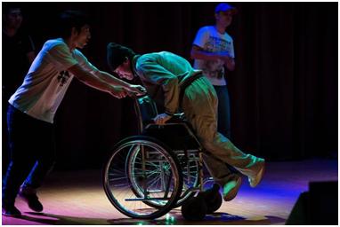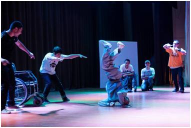 Prior to the performance, the guys got warmed up and rehearsed. Three of the team members are non-disabled, while the other members have disabilities – chiefly CP and oligophreny. Dance is a way for them to exercise and express themselves, and also serves as a locus for socialising. The guys have a lot of fun, and the non-disabled dancers (who are also the trainers) are not condescending in any way, but very supportive.