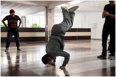 Since we agreed that the main focus of our project would be on how Adilzhan places importance on exercise and keeping fit, we arranged to shoot at a concert where the ARDI break-dance team had been invited to perform. I arrived before the other guys and was able to shoot how Adilzhan and Slava, the team’s leader negotiated the stairs at the venue.