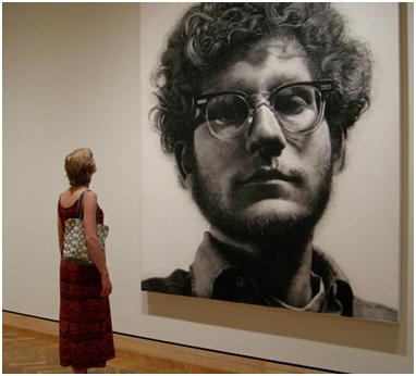 He works with huge scale portraits, though he prefers to call them heads rather than portraits, “to reinforce objective distance” (article). He regards himself as a builder who “builds painting experiences for the viewer.” He works from photographs that he himself takes of the subject and then constructs his upscaled image by using a grid: