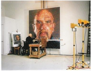 Hevey mentioned Sunny Taylor and Lehrer as examples of artists known only within disability circles (as disabled artists), and Close as an artist known outside of those circles and as such not a ‘disabled artist’ but an artist. I am familiar with Close’s work, but haven’t really engaged with it in any depth until now.