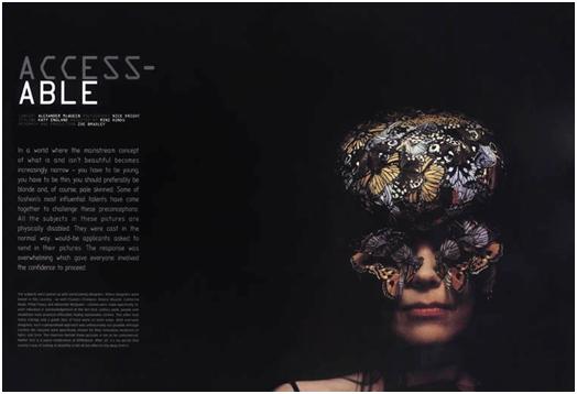 Prior to this, he used disabled models for a fashion article in Dazed & Confused together with photographer Nick Knight, entitled Fashion Able, in order to promote his belief that “beauty can be found in extreme difference and individuality“. The accompanying article explains the rationale behind the use of alternative body types, to challenge generalized preconceptions: “In a world where the mainstream concept of what is and isn’t beautiful becomes increasingly narrow, you have to be young, you have to be thin, you should preferably be blonde, and of course, pale skinned.” The article goes on to point out that the models were cast in the usual way, with overwhelming response. Although McQueen himself admitted that it took a little persuasion, since people were initially sceptical of the fashion industry.