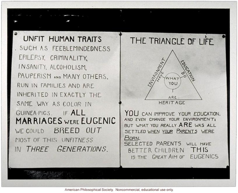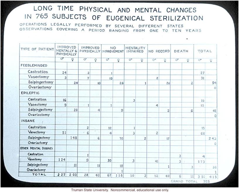 By which time 12 states had already enacted laws on sterilisation. The belief that “heredity plays an important part in the transmission of insanity, idiocy, imbecility, epilepsy and crime” meant that sterilization was authorized by law for “defective persons” whose reproduction represented “a menace to society.” (Lombardo, 2000).