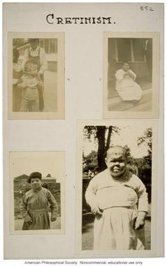 Posters that show cases of hereditary disorders, a chart showing the heredity of hare lip and cleft palate, and a flash card to illustrate certain abnormalities, in this case ‘cretinism’. At this early stage in the development of understanding genetics, the eugenics movement pounced on the idea of improving society, since feebleminded people were considered to be creating social problems as well as proliferating at a rate that threatened social resources and stability (their feeblemindedness meant that they had immoral characters and especially the women were thus drawn to the vices of licentiousness and prostitution). As such, the movement had a broader appeal to social conservatives who were concerned with preventing the increase in numbers of low-income groups and reduce the costs of caring for them.