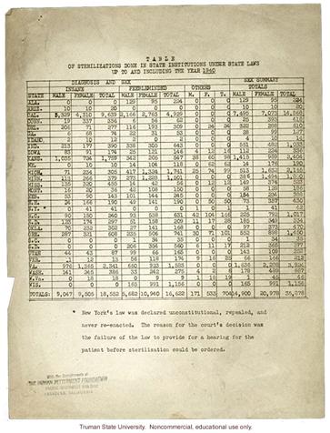 In Skinner vs. Oklahoma (1942), the Supreme Court struck down a law allowing the involuntary sterilization of criminals. However, the Court never prohibited states from sterilizing non-criminals, despite later scholarship showing the falsity of eugenic “evidence” used in Buck vs. Bell. Sterilization of the allegedly mentally ill continued into the 1970s in several states, by which time about 60,000 Americans had been involuntarily sterilized. (Eugenics Archive website)