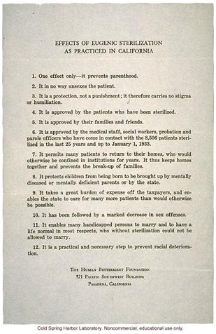 The list of reasons proposed by the Human Betterment Foundation includes the financial justifications for the obviation of the need for institutional care, as well as being a “practical and necessary step to prevent racial deterioration.”
