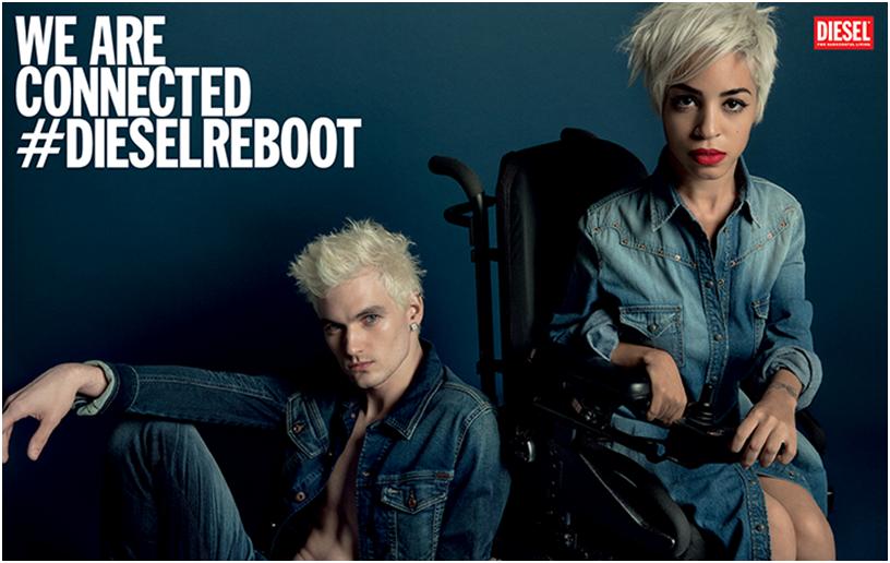 Down’s syndrome, paraplegia and amputees, but how much of this is about inclusion per se and how much about selling the organisation as being ‘right on’ is up for debate. Some argue that we should be content that there is at least some inclusion going on, but I rather feel that this is a newer form of exploitation, repackaged but essentially the same as the Elephant Man or the Hottentot Venus, a sideshow attraction set up purely to make money for the patrons: come and buy! Nobody seems to question the fact that despite some obvious inferences to disability (wheelchair, prosthetic, physiognomy) the physical appearance of the models still approaches that of the norms that society has put in place; they are visibly disabled, but not too grotesque that one feels the urge to turn away, they are still ‘photogenic’ in that respect. Even the boy with Down syndrome can be conceived as looking ‘cute’. On an optimistic note, the girl in the wheelchair, Jillian Mercado, who suffers from muscular dystrophy, was subsequently employed by Diesel as part of their ‘reboot’ ad campaign: