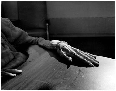 He is very concerned with the physical, with the tactile, with textures of skin, hair, nail and bone. The papery skin of old age and approaching death. Once again, the old people are photographed in close up as they near death, and this serves to fragment the body, so we are left to contemplate the symptoms of ageing rather than the person. This depersonalisation is Nixon’s way of remaining detached and unsentimental towards the subjects. His focus changes from the people themselves to the signs of their demise; in such a way he switches from the personal to the general, essential, the fate which awaits us all. Through his photography Nixon is coming to terms with his own ultimate demise.
