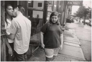 These images are taken in exactly the same cynical manner as his broader body of work – society as a whole is made up of freaks, one could almost say, looking at his body of work. In my search I came across this image, where in a kind of role reversal the midget is looking at a woman as if she is something strange (probably as a result of the way she is dressed) and seems to be giving her a wide berth, even apparently walking out into the road to avoid getting too close; which of the subjects is the more enfreaked in this image is debatable:
