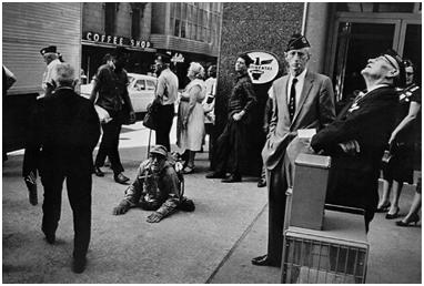 “Like Arbus, Winogrand’s use of disability is to warn the “normal” world that their assumptions are fragile.” On this point, I agree to a certain extent with Hevey, but I also think that this was a particular trait of the New Documents photographers, following directly on from Frank, and it was not restricted to disability alone; these photographers, especially the two in question here, were enfreaking the whole of society. They were questioning the utopian world that Steichen had proposed, since in reality so much seemed to negate the fact that “everything was all right” in the capitalist consumerist world. Hevey makes the point that Family of Man excluded disability for the same reason that New Documents included it: it was viewed as regression as opposed to progress. Disability is included by the later photographers since it shows the disharmony of a decaying society, the alienation that they set out to portray.