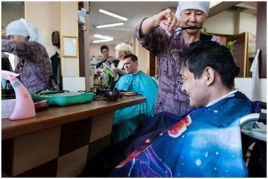 It was quite difficult to get a shot that included the rest of the salon while showing Yernar (since he was seated lower than the other clients) and avoid including myself in the reflection in the mirror!