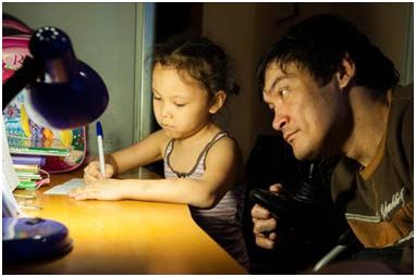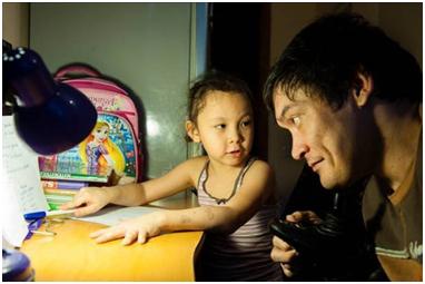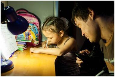 Yernar was working at his computer and having a spot of lunch at the same time. As I was shooting, his daughter and son kept coming and interrupting him for different reasons: