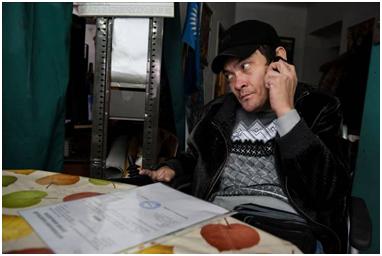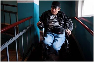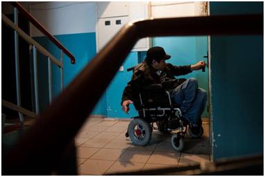 Since Yernar only works on Tuesdays and Thursdays from 1 to 4, I have to wait for suitable opportunities as I am usually working myself at that time. As soon as a window appeared I gave him a call and he told me to come over and we’d shoot a session where he’s on his way to work. He really gets the idea about presenting some kind of narrative, and suggested showing the process himself. I wanted to make it seem like a normal procedure – leaving the apartment and going to work, albeit in a wheelchair. My goal here is to show that Yernar is completely capable and in control, despite the obvious barriers to that ‘normalcy’…
