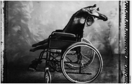 Some of Hevey’s still photography is available online, but without explanation of the project aims or artist intentions, they are merely portraits of disabled people. One of the more interesting and thought-provoking images is this one of a goat carcass in a wheelchair, a publicity image for the BBC2 film Freak Out: