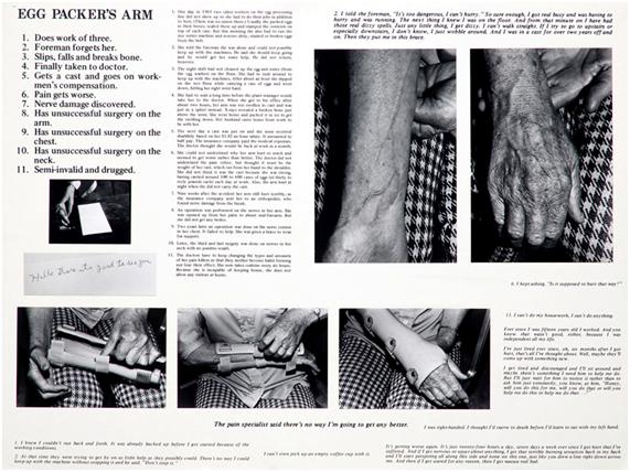 “Quotes from the workers are set in type so small that they are nearly unreadable. The titles are set in large type: “Machinist’s Lung,” “Egg-Packer’s Arm.” The body and the life are presented as they have been fragmented by management. Injury is a loss of labor power, a negative commodity, overhead. Injury is not a diminishing of a human life but a statistical impingement on the corporate profit margin.” (p 67-8)