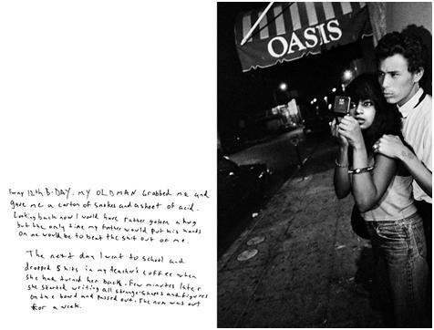 Goldberg uses mixed media, (primarily photographs, videos and objects) to tell his stories. Very often he encourages his subjects to write on the Polaroids he takes of them, which brings a whole new dimension to the notion of captioning as well as adding a vernacular aspect, since the handwritten scripts may be unfamiliar and illegible to many viewers, and rather than elucidating merely serve to add an element of geographical (and thus social) remove, or exoticism (is this a good thing?). As O’Hagan writes, Goldberg manages to “create a fragmented narrative that fractures the received conventions of reportage or straight documentary” these narratives do not fit in with conventional narrative techniques or presentation, while the work also serves to question those very parameters: