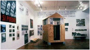 “Mr. Berghash’s photographs appeared earlier this spring in ”Homeless: The Street and Other Venues,” the second of Martha Rosler’s three installations on Wooster Street in SoHo at the Dia Foundation, which has been sponsoring a yearlong program called ”Town Meeting” on ways that artists can, or do, affect their social environment. The installation included shelter for the homeless (sofa, chairs, a TV and a corridor lined with beds) along with works by homeless artists, traditional documentary photography and drawings of such projects as Krzystof Wodiczko’s Homeless Vehicle (a metal carriage that meets the needs for sleeping, storage and mobility). Charts depicted the widening disparity between rich and poor, and a U.S. Department of Housing and Urban Development graph plotted a spiraling number of households with incomes under $10,000 against a vanishing line of apartment units that rent for less than $250 a month.”