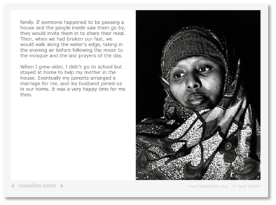 Respecting the subjects as individuals and trying to challenge the ignorance and prejudice that they face – this is exactly the kind of work I am trying to achieve. I think it is important that Sheikh not only publishes his work in book form, but also makes the work available online for wider dissemination. Perhaps this is a way for me to present my work? The portraits are displayed alongside more abstract pictures, Koranic verses, autobiographical testimony and finally information on the history of refugees from Somalia in the Netherlands and relevant articles from the UN convention on human rights. To my mind, there is a lot of text here on the website: