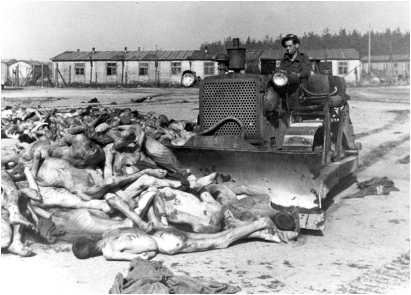 This image she uses to conflate the idea of camera and bulldozer as human-operated machines which “do a similar job of burial that represents forgetting“, as well as both being reminiscent of weapons (the camera of a gun, the bulldozer of a tank), “…when it comes to images of genocidal murder, the postmemorial act of looking performs this unwanted and discomforting mutual implication.” Is this true, or is it just in the eye of the beholder? For me the image of the bulldozer is brutal in its insistence that there was no other way to deal with the sheer number of human corpses (a final inhumane debasement after the humiliation, torture and execution of these wretched souls), while the driver’s apparent nonchalance (cigarette hanging from the corner of his mouth) provides the photograph’s Barthesian punctum.
