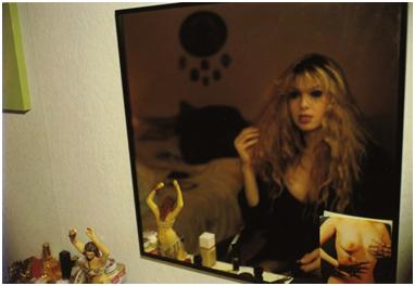 Why this image more than any other has become iconic and representative of Goldin’s work has probably more to do with the history behind it than anything else. It has been pointed out that although we are not told that Goldin was beaten by a man, the elements of male dominance in the image are enough to convey this attitude (the styled hair, delicate earrings, silk blouse and pearl choker are markers of feminine self-presentation – even the pretty curtains can be seen as suggesting a woman’s pleasure in decorating the domestic space!; Goldin has made an effort to make herself look desirable and feminine for the camera despite her bruising); while the red lips are emphasised almost defiantly (her assailant was targeting her eyes – she is after all a visual artist) – the lips are undamaged and as such can still speak, resist, remain unsilenced. “…in this photograph Goldin shows the hidden transcript of male violence against women and she shows the public transcript of woman’s self-engagement in systems of domination, the “happy” story of woman’s pleasure in shopping for clothes, fixing hair, applying makeup… But by revealing her wounds Goldin shows the violence that holds in place this very system of domination that imposes on woman the supposed happiness of make-up and pretty curtains.” (Raymond)