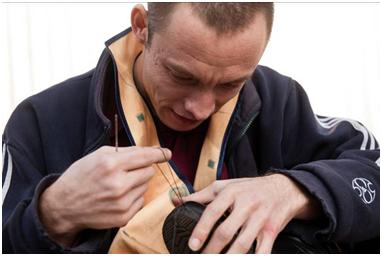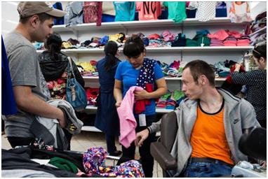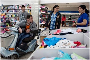 This sense of ‘normalcy’ is carried over into the second section, where Adilzhan is talking about his friends, and we see him chilling out and having tea with both disabled and non-disabled people. Here everyone is sitting and so Adilzhan’s disability is not apparent or the focus of attention. He then goes on to speak about his experiences of other disabled people who, in his opinion, have basically given in to the stereotypes. Rather than showing those others, the images show Adilzhan going about his daily business, running errands and going to the market. I was considering using some of the shopping centre images here, but I felt that I had already done that with Dinara, so this section ends on images of Farkhat teaching Adilzhan how to repair shoes. This fits with the voiceover, since we hear him say that disabled people also want to work and have families just like any other people.