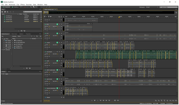 I used Adobe Audition to modulate the sound recordings and edit out false starts, hesitations and other distractions as best I could without disrupting the natural rhythm and intonation. At times there may be background noises (for example, Yernar’s child is calling for him at one point during the interview), but I am not proficient enough at using sound editing software to even begin any attempt at removing them. This is a screen shot of the editing of Yernar’s interview in multiple tracks: