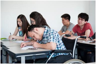 I wanted to capture the feel of university classes that Amanat was attending. Although he is much older than the other students, he is accepted as an equal, and this is what I wanted to get across in the campus images. This series set out to show that Amanat had to study really hard – for the observant will notice that this lecture is actually in English. I aimed to portray Amanat as being on the same level as the other students, while the shots include his wheelchair without drawing unnecessary attention to it – it is simply included as a visual reminder of Amanat’s impairment (see my research on Garland-Thomson).