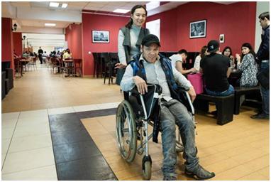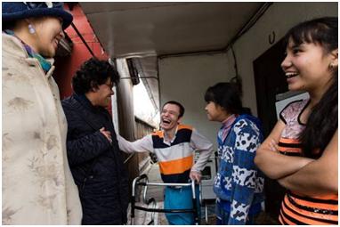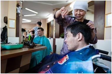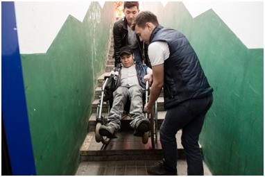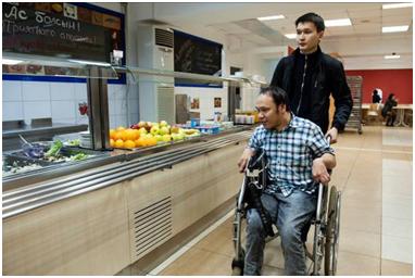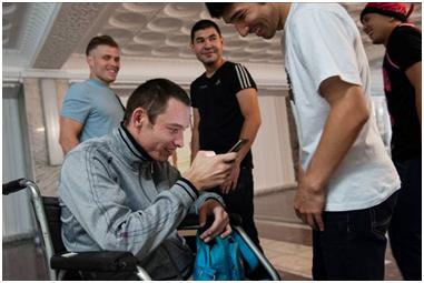 Although I had practically given up hope on Adilzhan, he seems to have sorted out his issues and we have been able to meet up on numerous occasions. Nevertheless, his unreliability has made me keep him on a back burner, and I’m not sure if I’ll use the materials to make a film. In this series, he wanted me to show how he doesn’t just communicate with disabled people, but numbers among his friends able-bodied people as well. This is something that I’ve noticed about disabled people, that they tend not to seek out each others’ company, and there are several reasons for this. Yernar told me that to begin with he couldn’t understand disabled people – in the sense that they were all self-pitying and had no drive, and so he tended to avoid them. Dinara told me that being around non-disabled people helps her to feel ‘normal’, in other words she isn’t focusing on her disability, while it also encourages her to socialise and behave in ‘normal’ ways (shopping, going to the cinema or out dancing). Being accepted as an individual by non-disabled people must be a huge boost to one’s self-confidence.