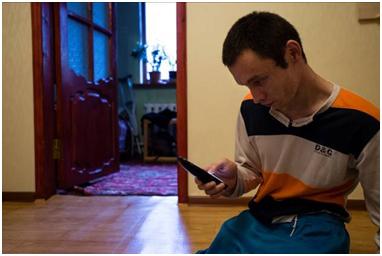This time some visitors came to see Adilzhan, Askar and Malika who I’d begun shooting for the project before I decided to focus on people with CP. As is typical among young adults these days, it wasn’t long before mobile phones were unpocketed and they began showing each other photos or video clips…