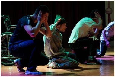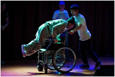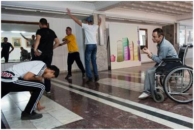 Prior to the performance, the guys got warmed up and rehearsed. Three of the team members are non-disabled, while the other members have disabilities – chiefly CP and oligophreny. Dance is a way for them to exercise and express themselves, and also serves as a locus for socialising. The guys have a lot of fun, and the non-disabled dancers (who are also the trainers) are not condescending in any way, but very supportive.