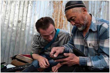 On this particular visit, we went to the local mosque, where the caretaker, Farkhat, is teaching Adilzhan how to repair shoes.