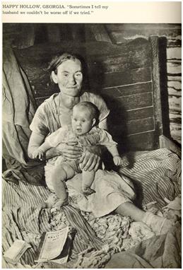 “…equally effective photographs taken by Margaret Bourke-White […] showed that stunted, starved individuals were not products of Caldwell’s fictional imagination, but that deformity, disease, and desperation actually existed extensively in the South.” (Snyder 1988, p 258)